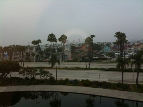 Oh . . . and what's that ghostly ring of light around the ship in the picture? An electronic image artifact? A reflection in the hotel hall's window of the iPhone's circular camera, caused by holding it close enough to the window that the hall lights wouldn't get in the picture? A spectral manifestation of Koot Hoomie Parganas, Thomas Edison, Sherman Oaks, or (shudder) Loretta deLarava?